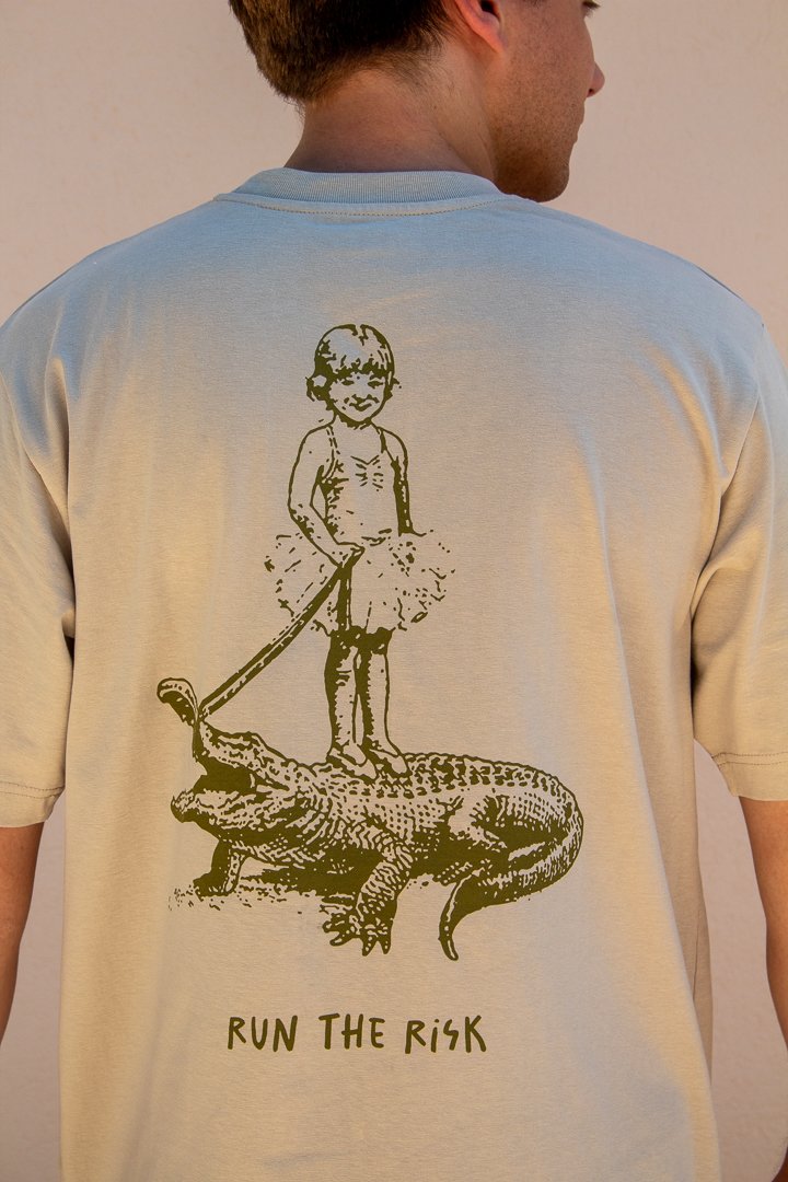 Experience ultimate comfort and style with our “Run the Risk” T-shirt, crafted from 100% organic cotton. This heavyweight shirt in the beautiful Dessert Dust color offers a relaxed fit, perfect for a casual and comfortable look. Are you ready to run the risk? Add this statement piece to your wardrobe and let your personality shine.